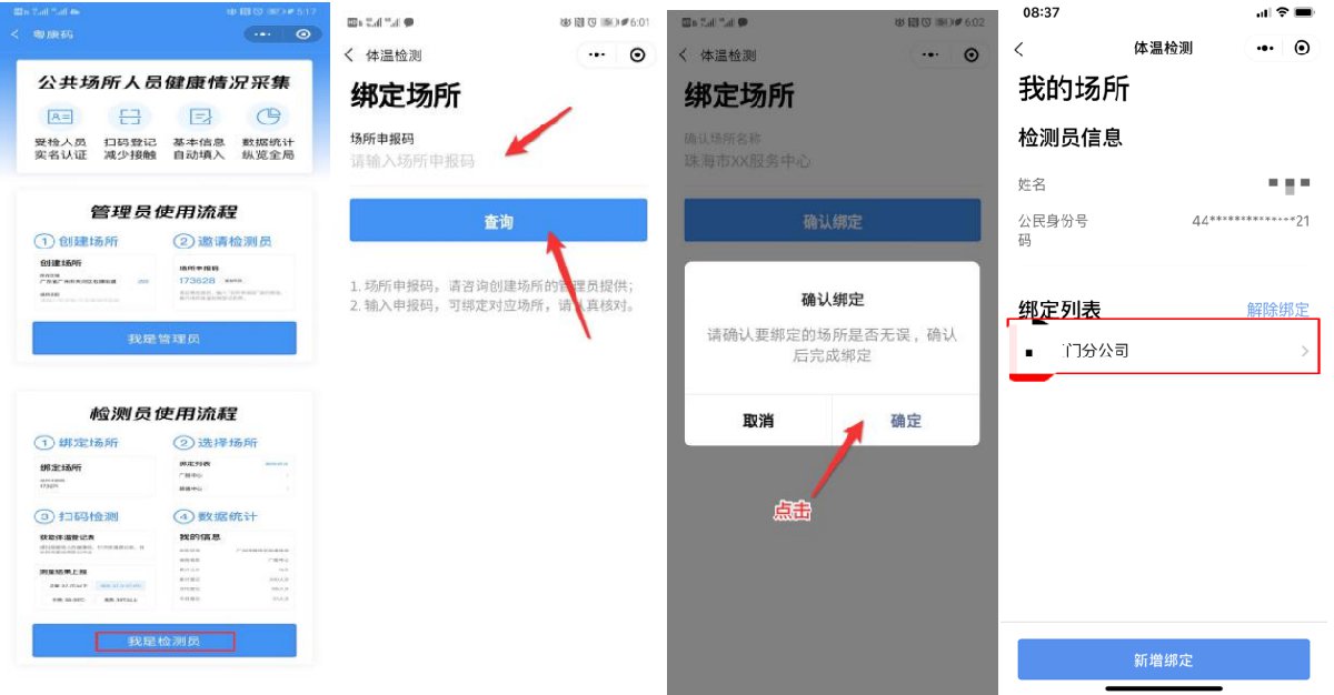 步骤二:点击“公共场所”-“我是检测员”,输入场所申报码完成绑定