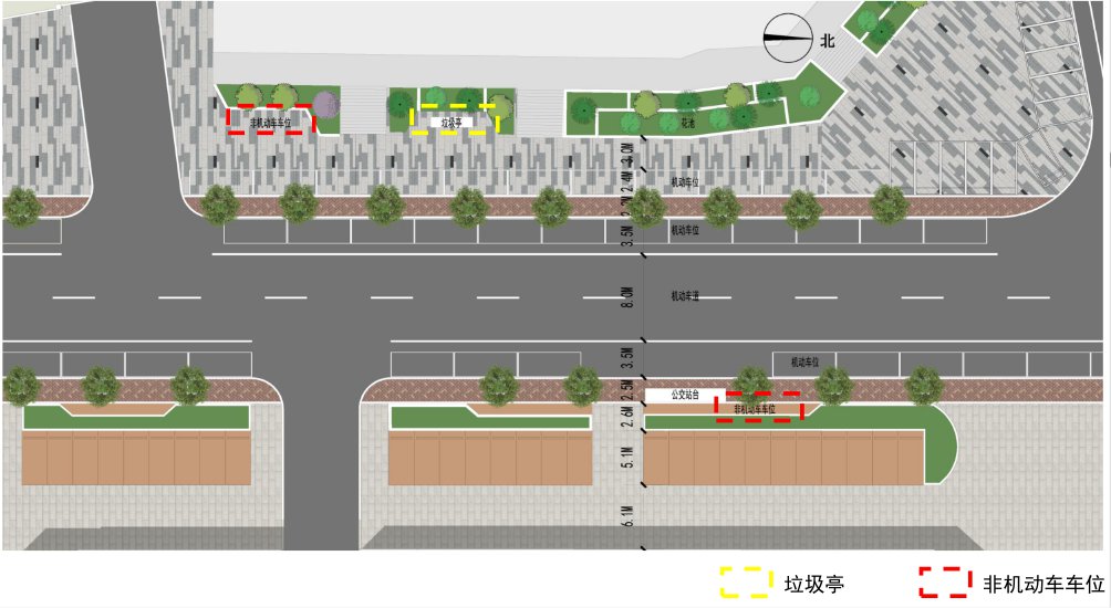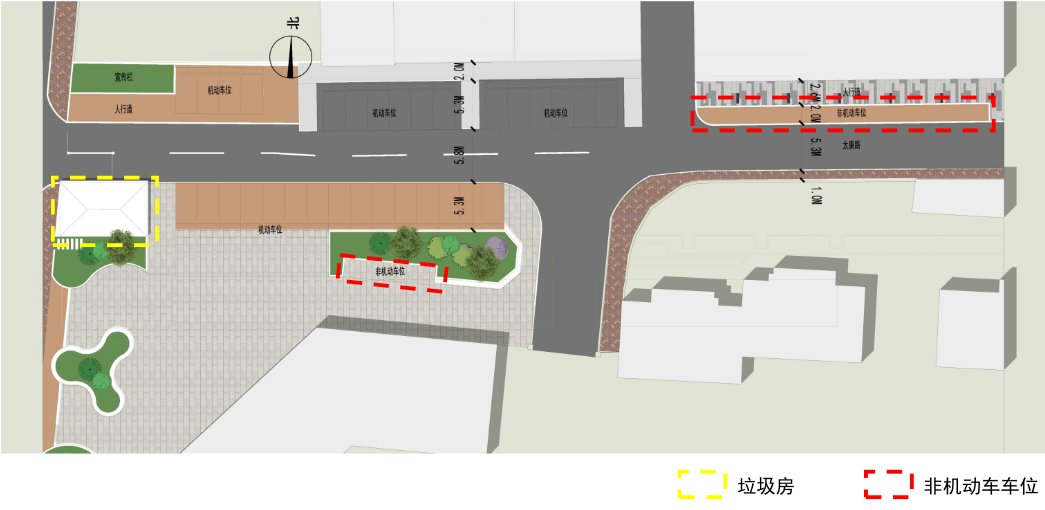 太康路将优化西侧机动车位,采用彩色透水混凝土,东侧商铺铺装采用仿石透水砖,非机动车位采用彩色透水混凝土。