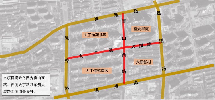 大丁佳苑周边提升改造工程已正式动工。大丁路、太康路、青山西路三条道路将对路段停车位半幅封闭,按时序进度分段施工