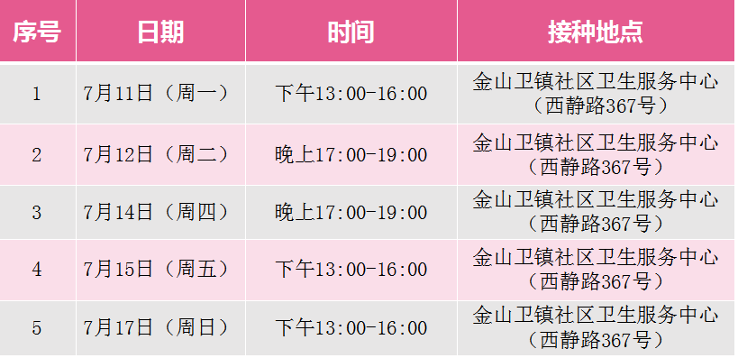 7月11日-17日金山卫镇新冠疫苗接种安排