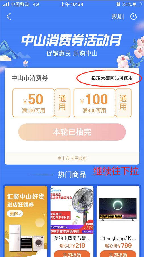 消费券领取后3天有效,仅限本次活动指定的工商注册地在中山的天猫商户(天猫国际除外)可用。