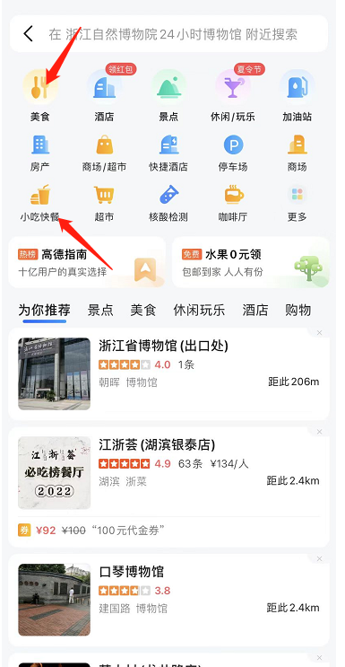 举例:在高德APP上输入“浙江自然博物院24小时博物馆”,然后点击下方的“周边”,然后进入下一页面,选择“美食”或者“小吃快餐”都可以(仅供参考)