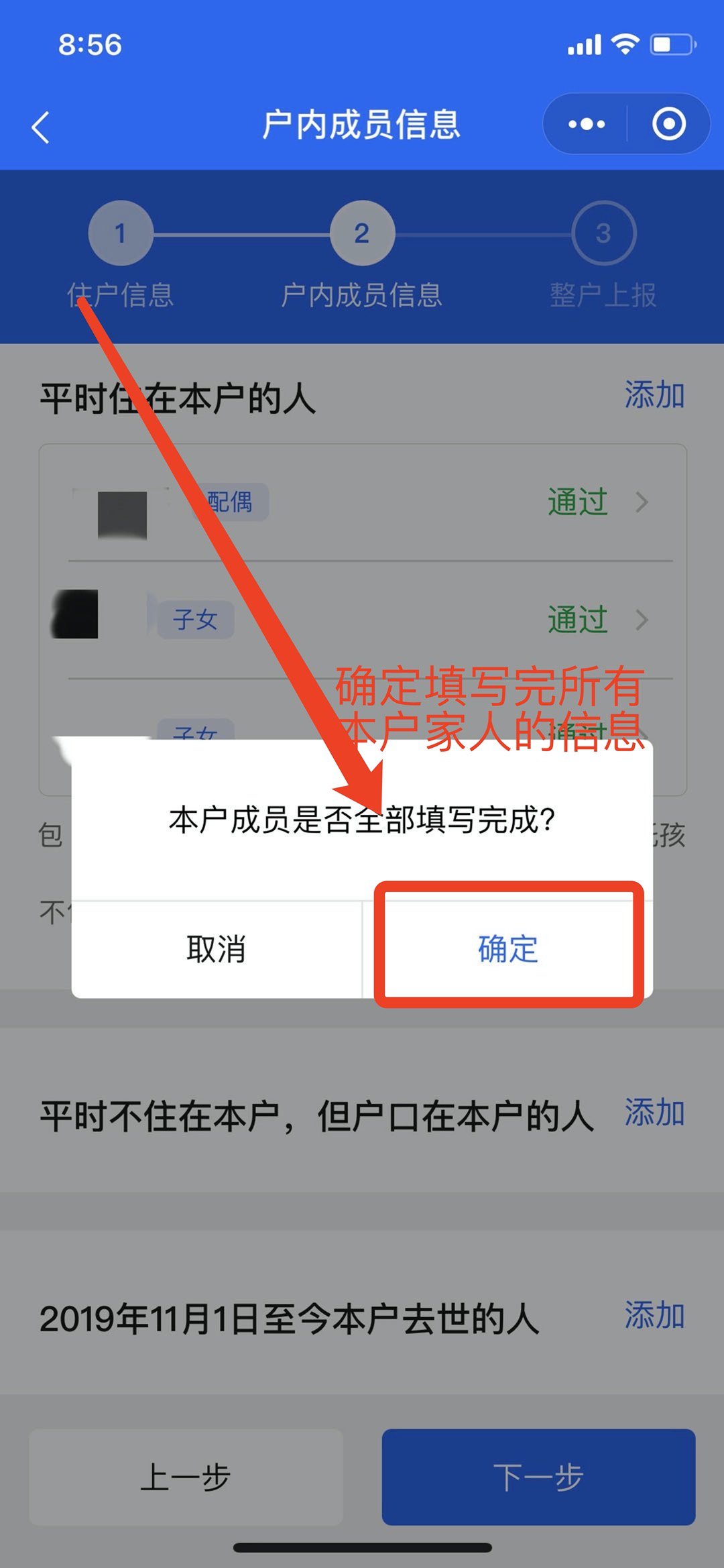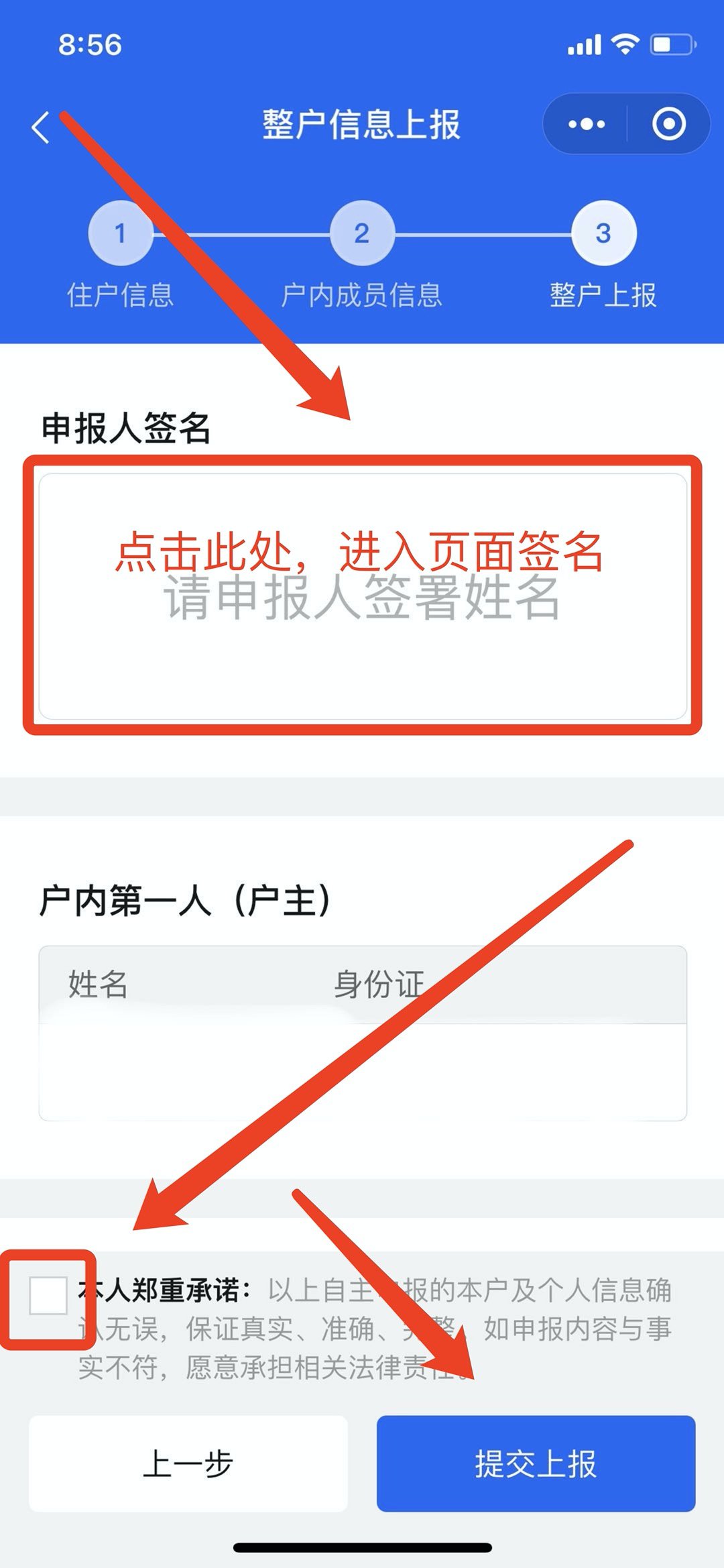 4.第三步整户信息上报,本户信息填报完成后,需由申报人确认并签署姓名,勾选《本人郑重承诺》后提交上报。