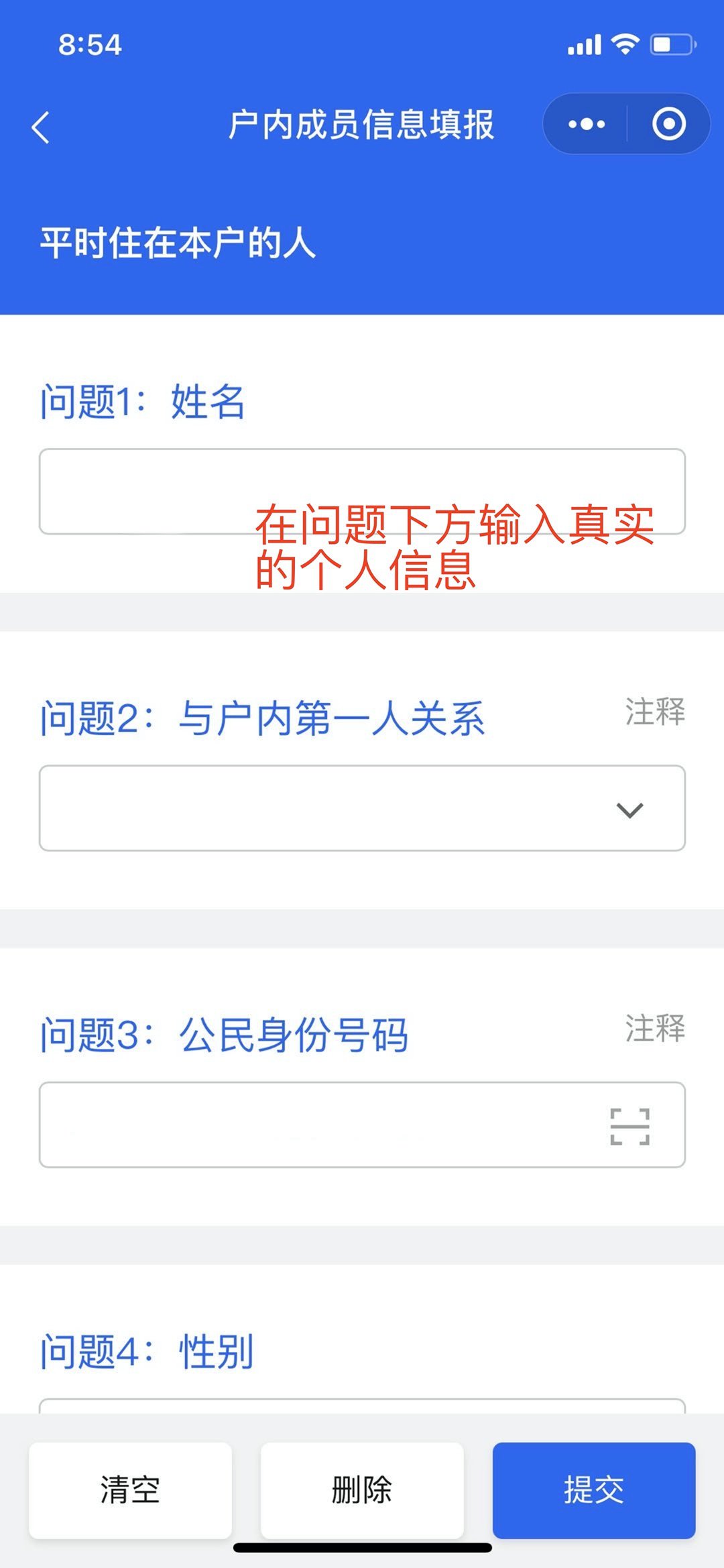 3.第二步填写户内成员信息,包括姓名、公民身份证、性别、出生年月、民族、普查时的居住地、户口登记地、受教育程度等。