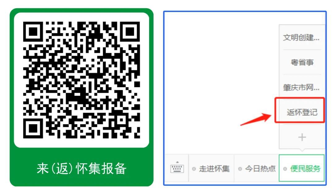 怀集县外来(返)怀人员可微信扫一扫“返怀登记”专属二维码或通过“怀集发布”公众号—便民服务—返怀登记进行网上报备。