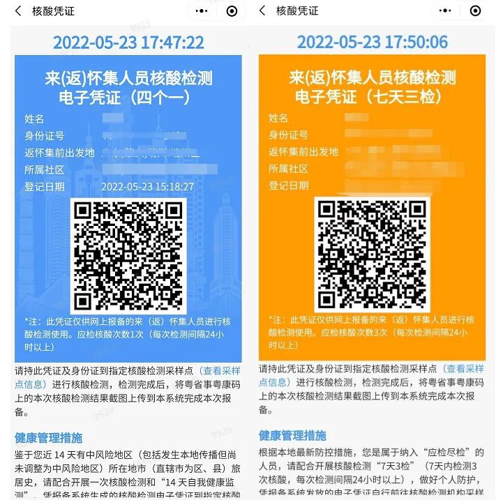 3、报备群众根据社区返回的审核结果进行下一步的健康管理措施,如属于“应检尽检”中的7天3检或3天2检人员,系统会发放对应核酸检测电子凭证(凭证样式如下):