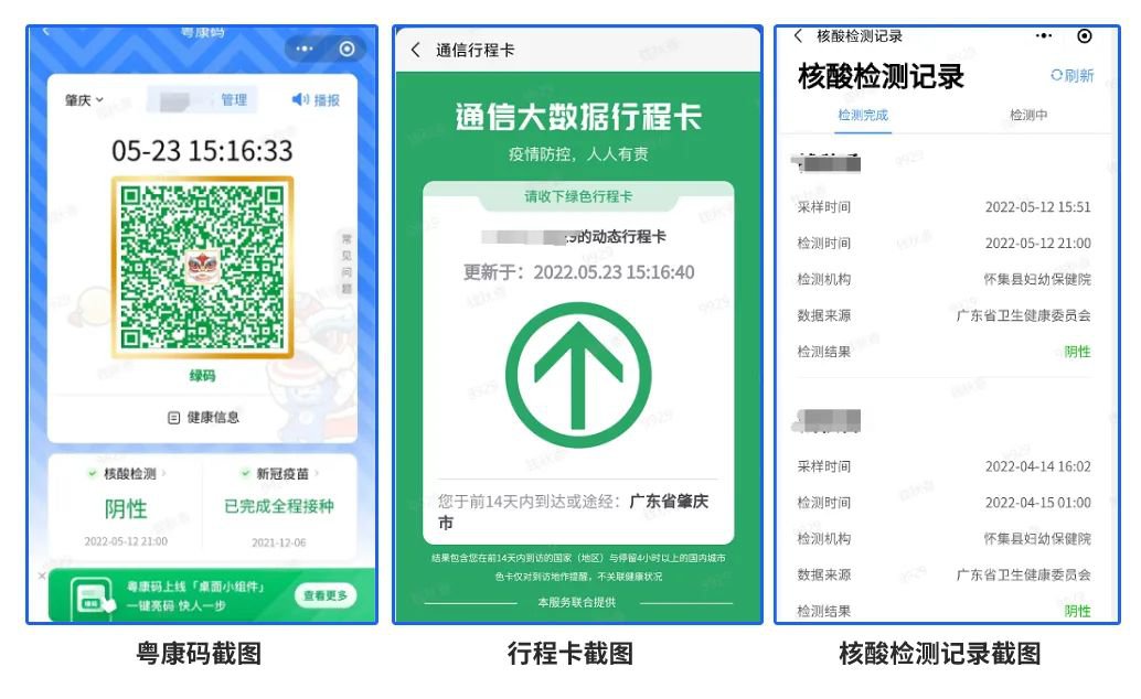 2、报备前请提前准备好粤康码、行程卡、近期核酸检测结果三张截图,其中粤康码与行程卡的更新时间应为报备当天。三张截图图例如下: