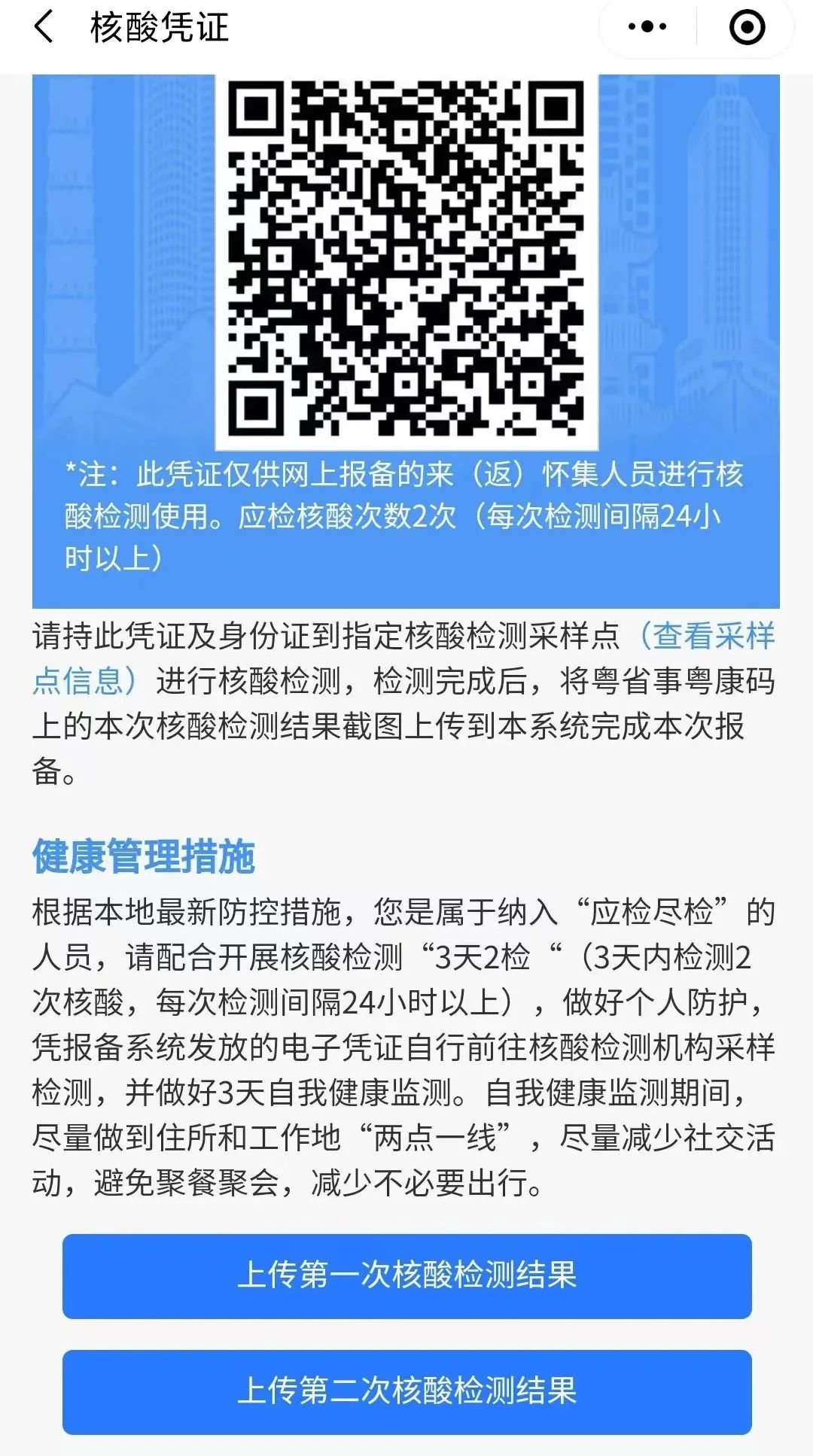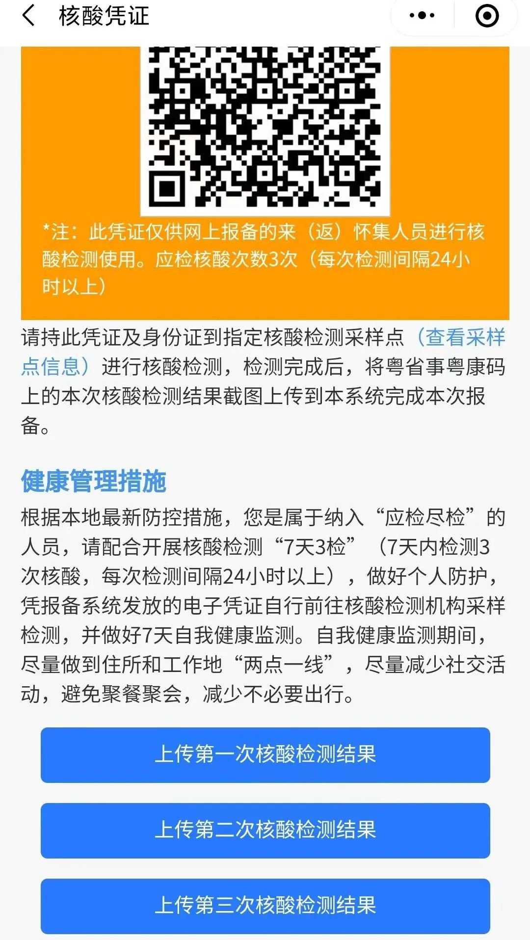 报备人可凭凭证到指定的核酸检测点(可点击查看采样 点信息查看采样点位置和导航)进行免费的核酸检测,要注意每次核酸检测间隔24小时以上。如属于“愿检尽检”自的3天2检人员,呼吁报备群众自费到核酸检测机构进行2次核酸检测。