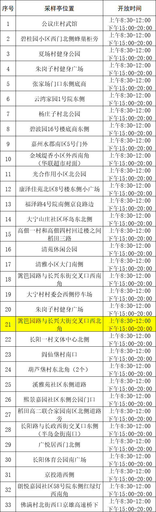 长阳镇核酸检测采样亭位置及开放时间