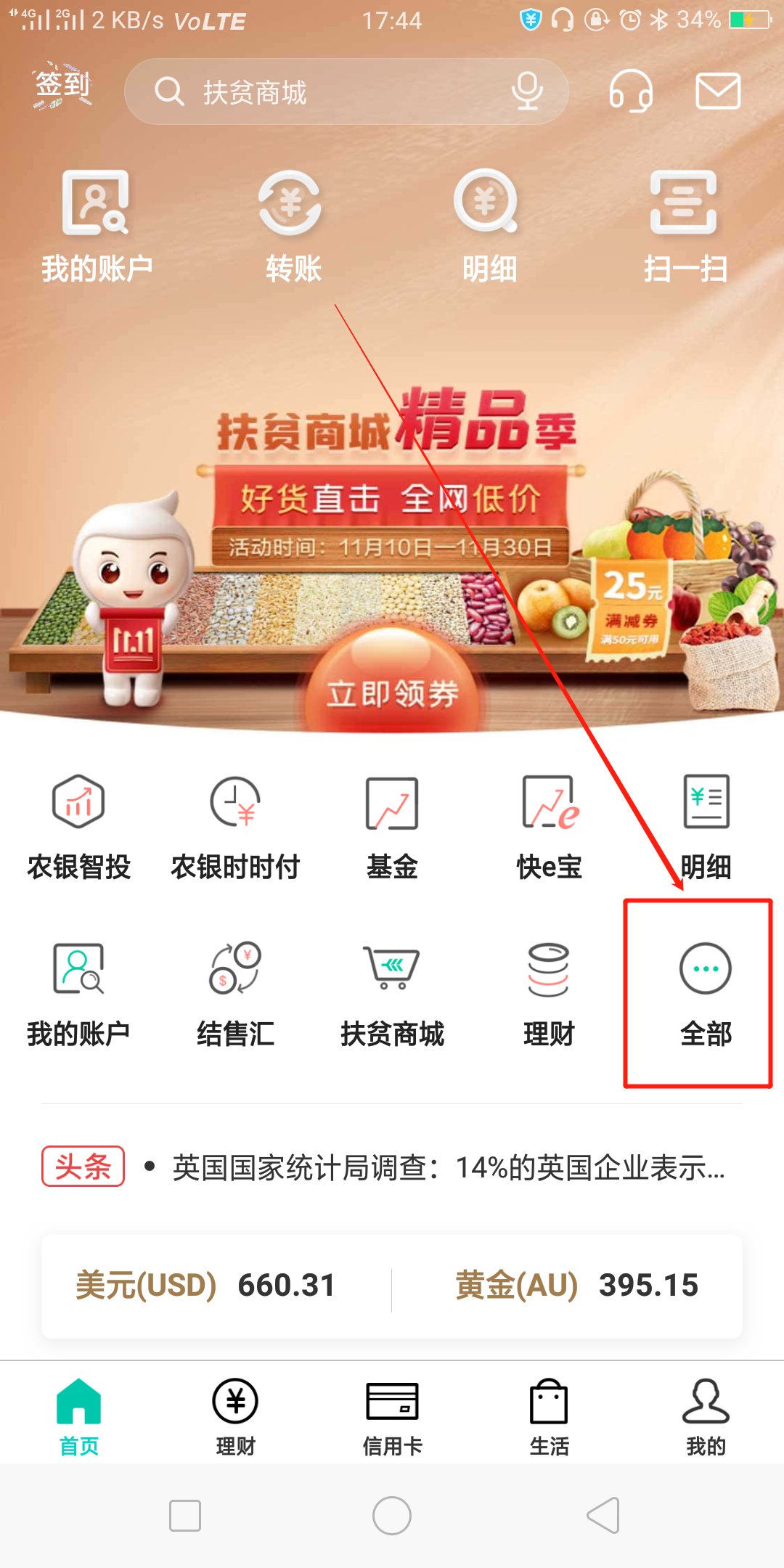 1.在手机各大应用商店搜索并下载“中国农业银行”APP并进入;