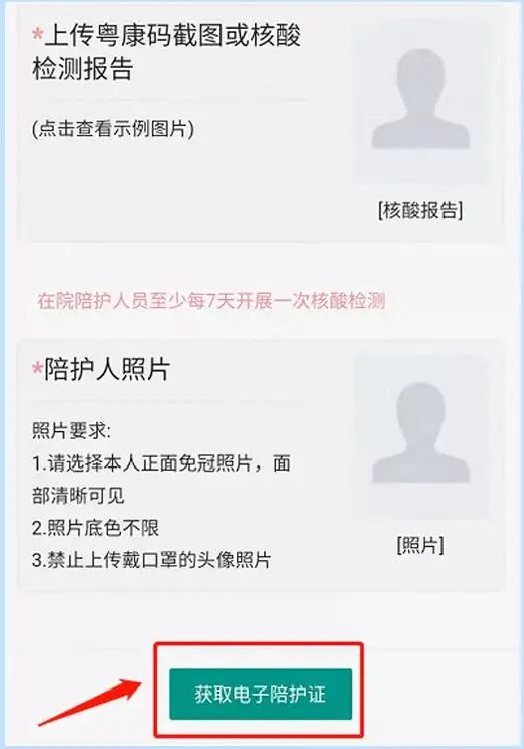 1.进入电子陪护证申领页面(点此进入),阅读个人承诺书后请填写并提交7天内核酸检测报告、陪护人员照片等信息。提交信息后请联系科室护士审核后方可获得电子陪护证。
