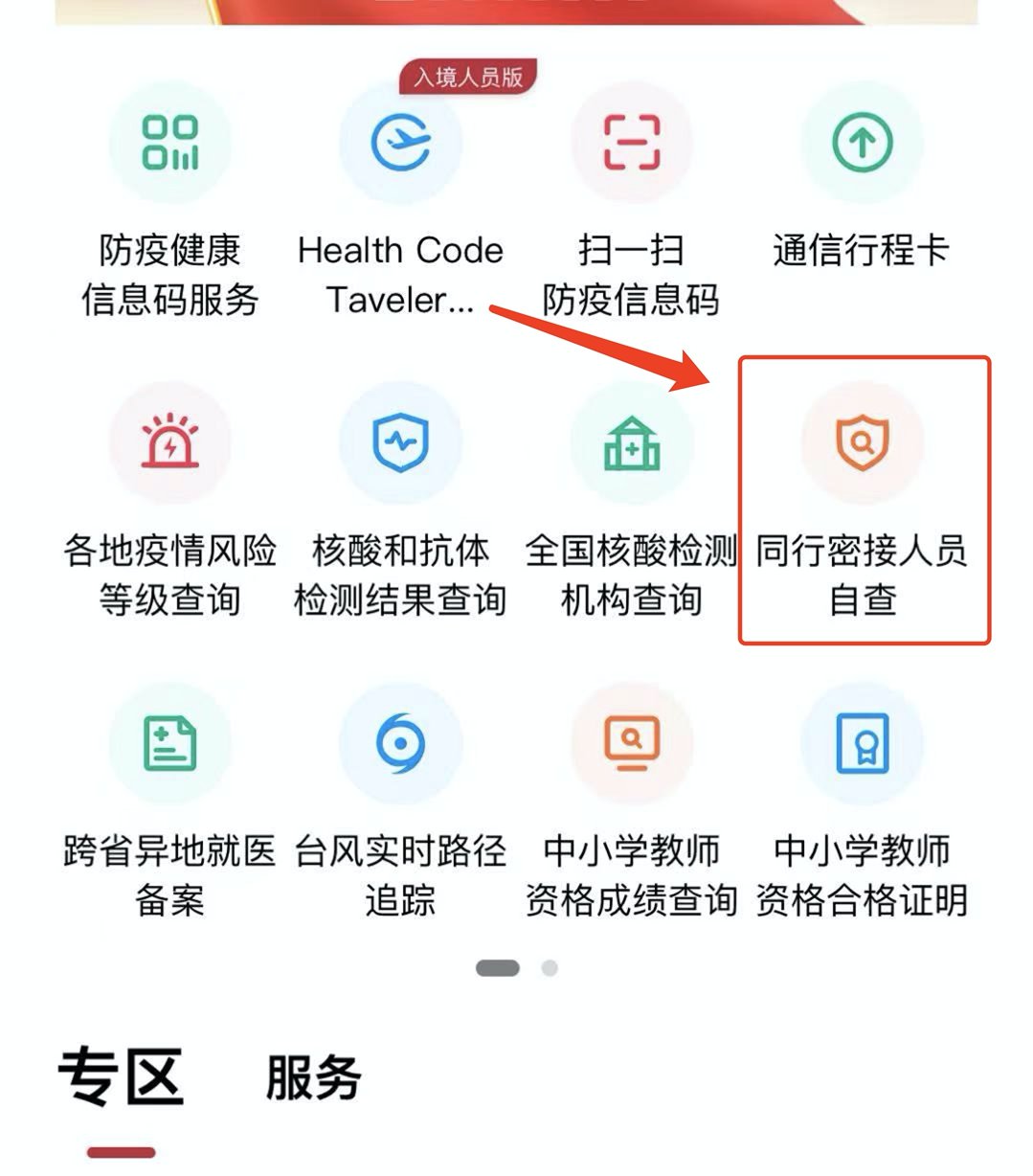 第二步:在首页找到“同行密接人员自查”点击进入。