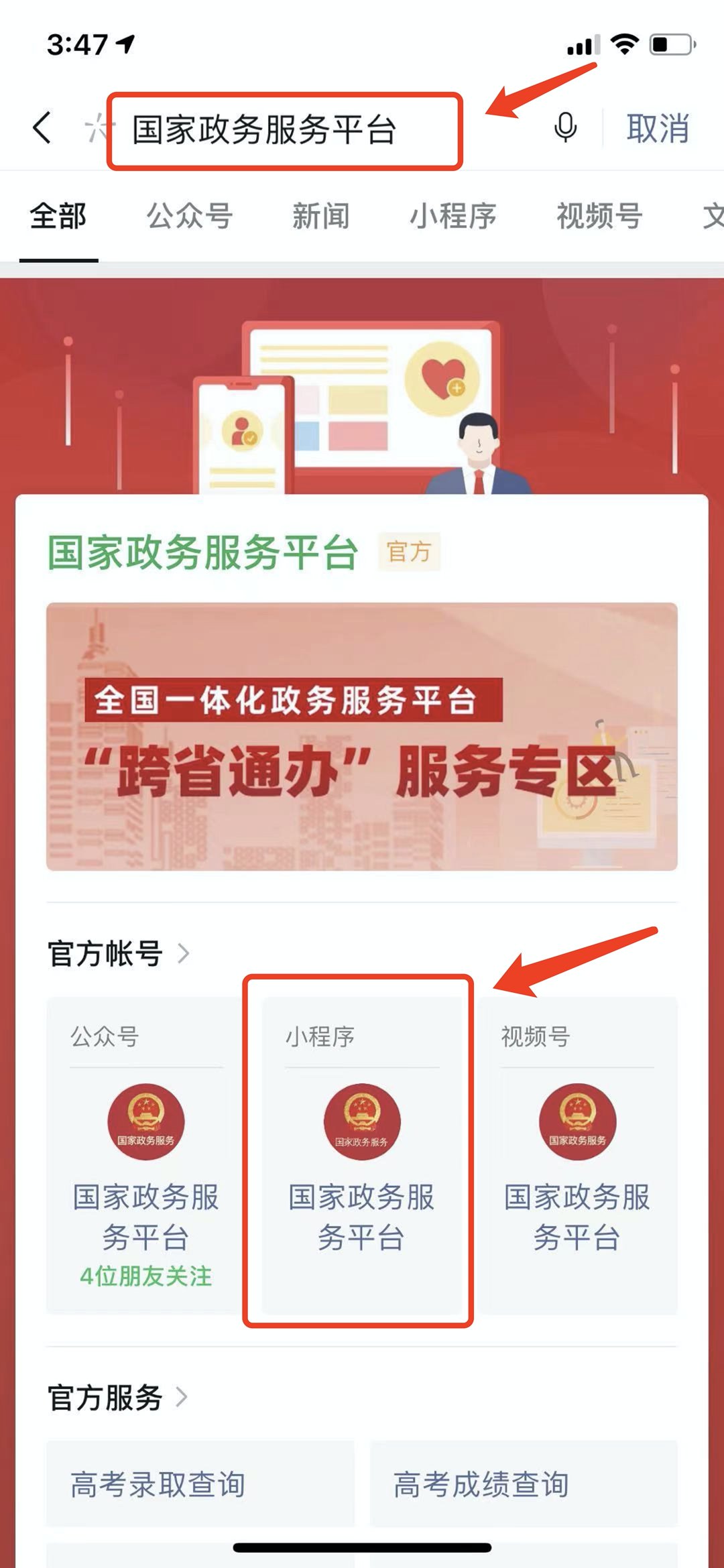 第一步:微信搜索“国家政务服务平台”,进入小程序。