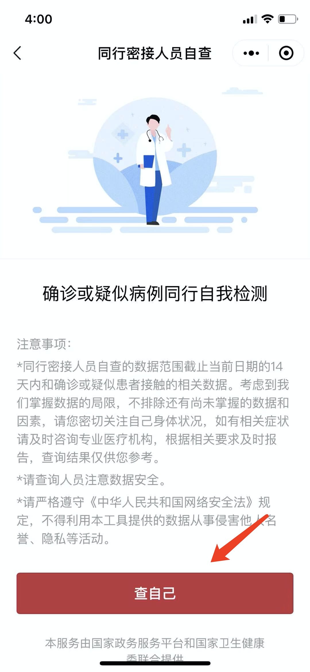 第三步:进入页面后阅读注意事项,点击【查自己】。