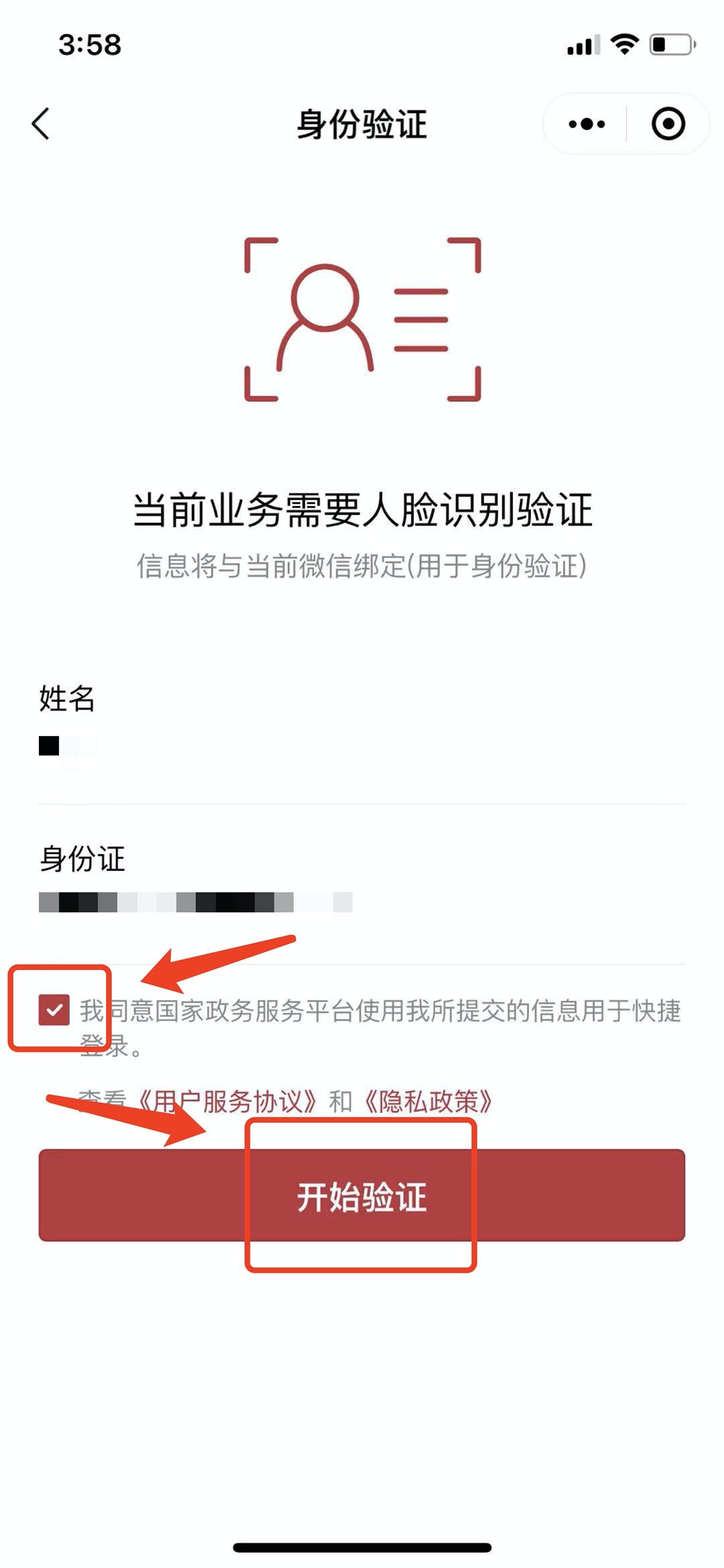 第四步:填写个人信息,点击同意【开始验证】跟着指引操作进行人脸识别。