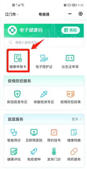 用户通过微信搜索登录“粤健通”小程序,点击“健康申报卡”登录,或者扫描就诊医疗机构的预检分诊健康申报二维码登录。