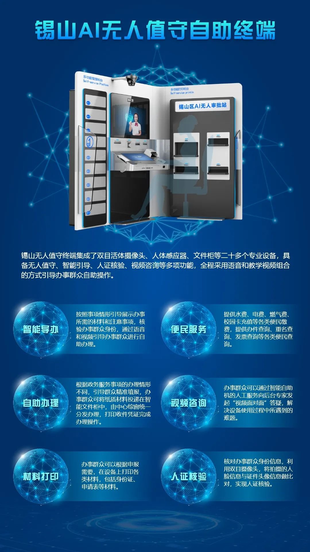 “公务舱”以市行政审批局成全E站为基础,增设了人社、税务、交警、不动产、法院、银行等自助终端,重点打造了锡山AI自助服务机,实现智能导办、身份核验、文件存取、便民缴费等服务。