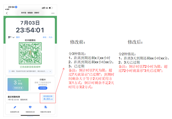 A、根据防疫需求,将核酸有效期“7天”改成“72小时”,涉及健康码页面上1个模块的内容修改,具体如下: