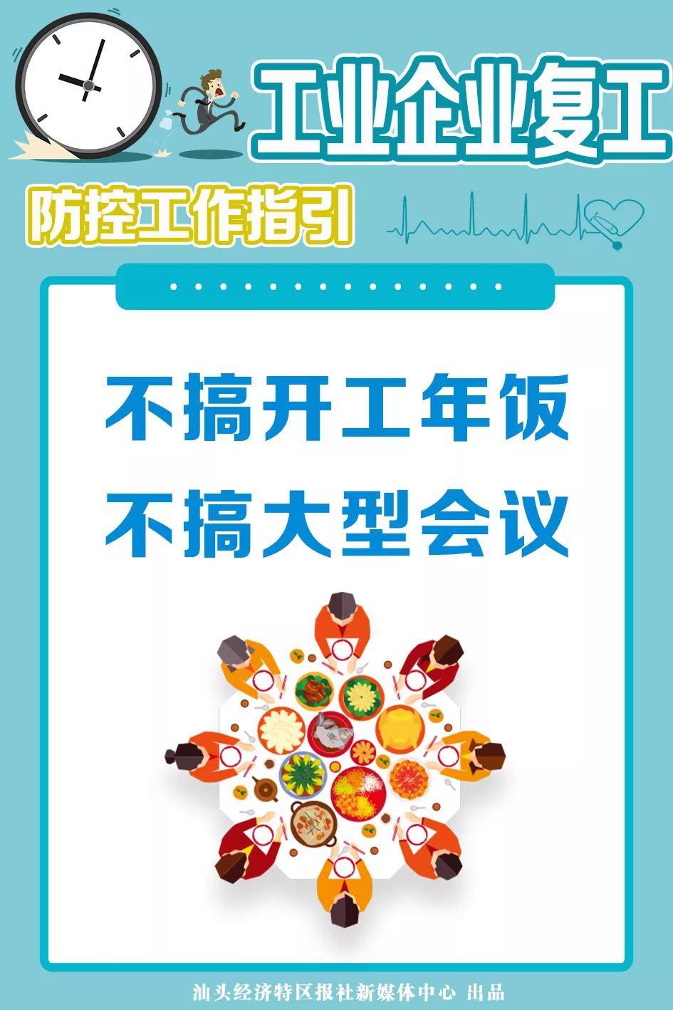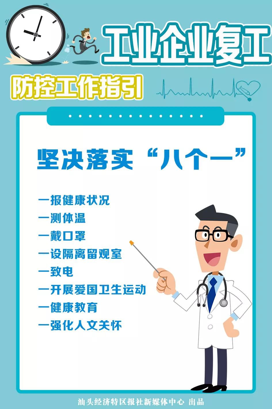 元宵节后复工潮即将到来,疫情防控面临重大考验。为做好疫情防控、重点物资保障、复工复产等工作,汕头经济特区报社新媒体中心整理制作了这份工业企业复工防控工作指引,希望各工业企业复工后要通过了解员工健康状况、测量体温、佩戴口罩、设隔离留观室、开展爱国卫生运动、加强健康教育、强化人文关怀等措施做好防控工作。