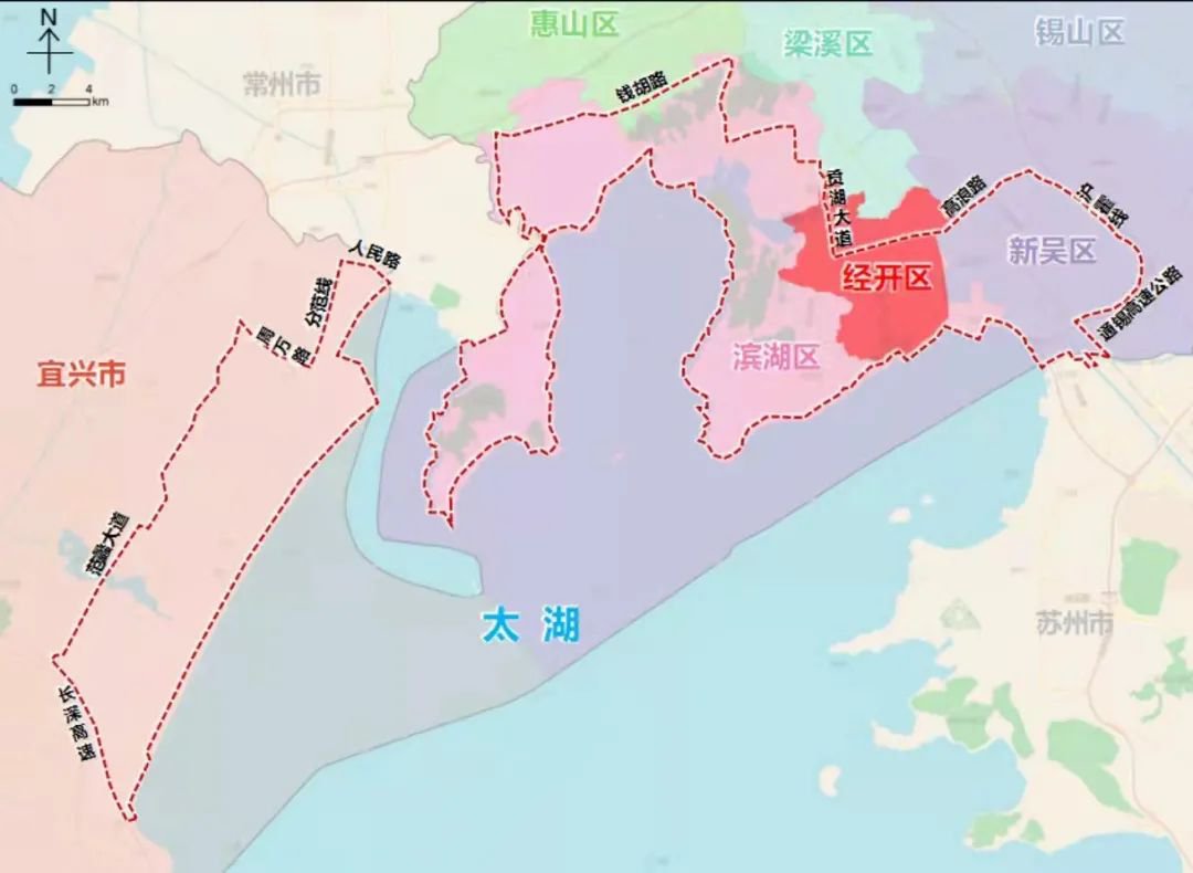 科创带东以太湖岸线为界,西至宜仇线、环保大道、宜北路、虎皇大道、夏扶路、分范线,南至宁杭高速、104国道、通蜀路,北至振丰路、庆源大道、分范线、周万线,总面积约380平方公里,湖岸线约34公里。