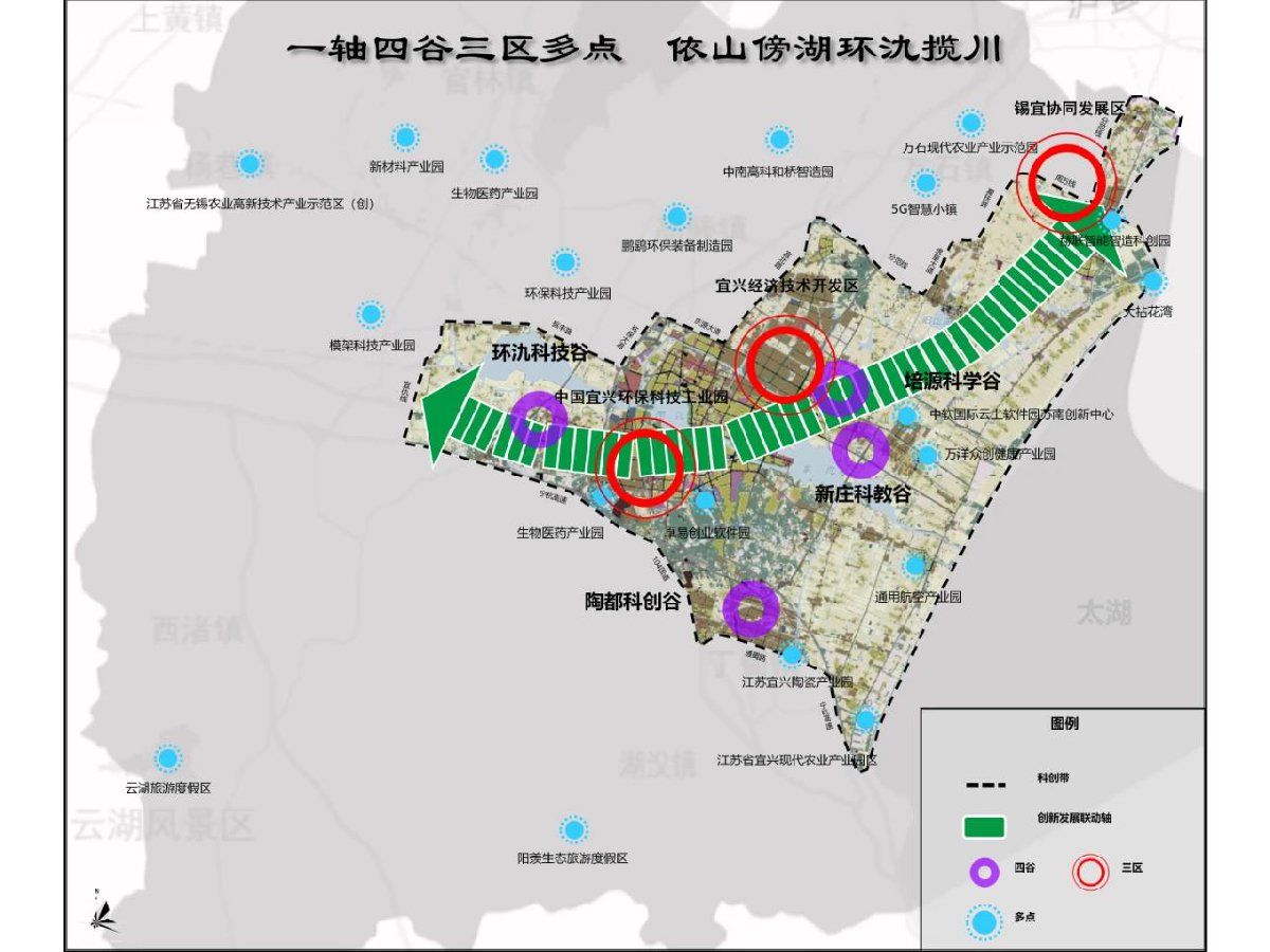 以太湖湾科创带为核心引擎,协同梁溪科技城、江阴霞客湾科学城、宜兴陶都科技城、锡山宛山湖生态科技城和惠山洗砚湖生态科技城,形成 “一带五点”的市域创新空间体系。