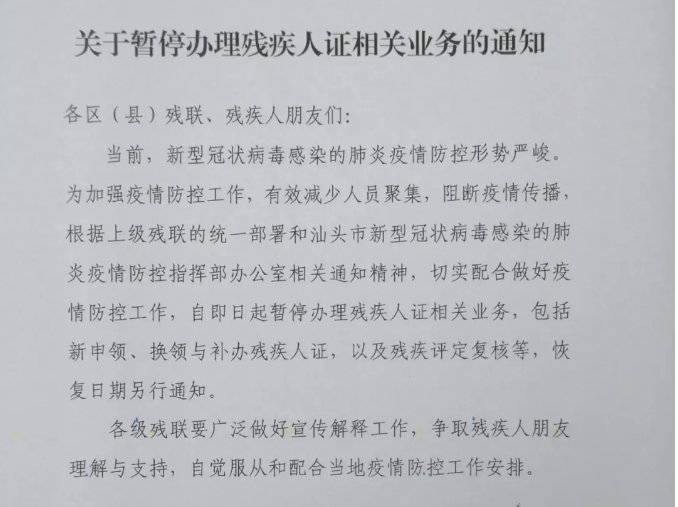 汕头暂停办理残疾认证,恢复时间另行通知,具体通知如下: