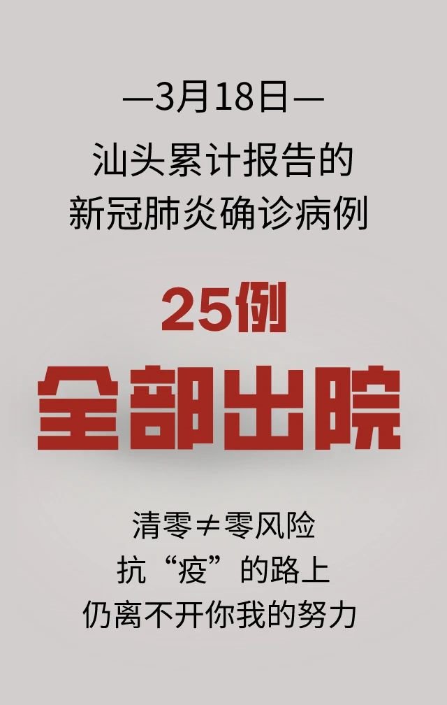 男,32岁,汕头市澄海区人,1月18日从武汉出发,22日返回汕头家中,23日晚经澄海区疾病预防控制中心动员,患者至澄海区人民医院接受医学观察,25日20时,省疾控中心复查检测结果阳性。已治愈出院。