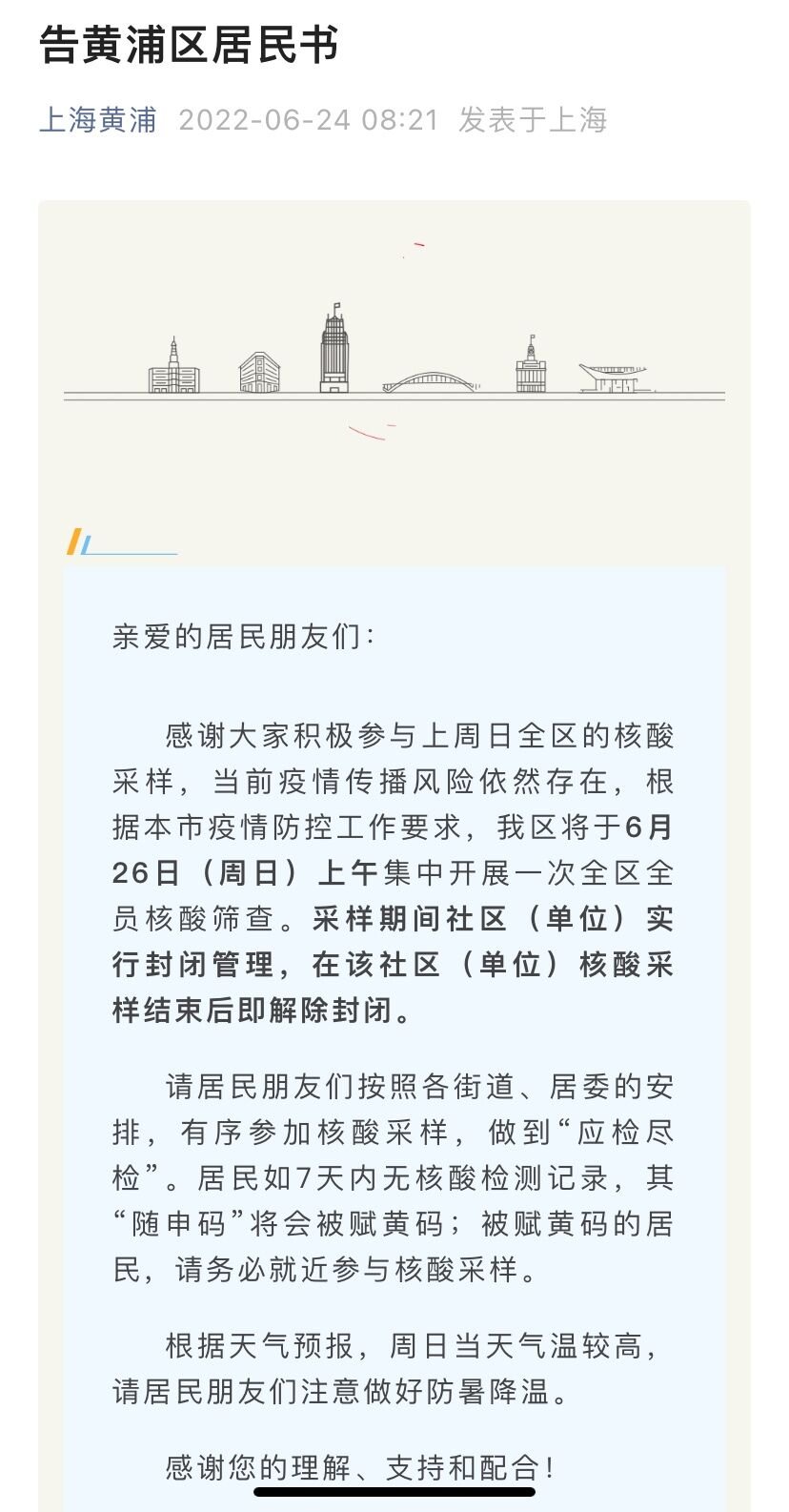 感谢大家积极参与上周日全区的核酸采样,当前疫情传播风险依然存在,根据本市疫情防控工作要求,我区将于6月26日(周日)上午集中开展一次全区全员核酸筛查。采样期间社区(单位)实行封闭管理,在该社区(单位)核酸采样结束后即解除封闭。