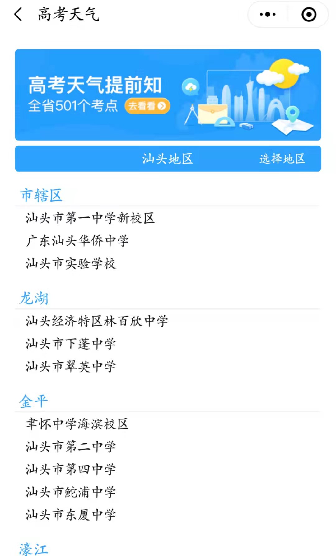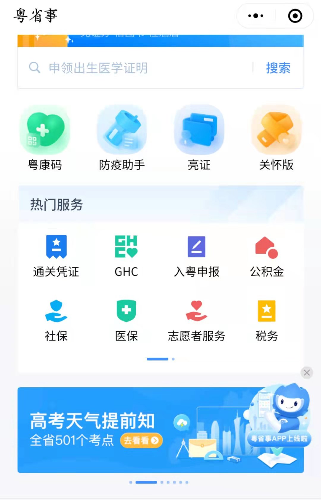 进入“粤省事”小程序,点击“高考天气提前知”,可获取各考点实时天气预报。