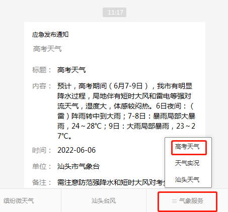 进入“汕头天气”微信公众号,点击“高考天气”即可查看。公众号信息精细化到每个考场的天气服务,有预警信号、分钟级降水预报,逐小时天气,7天天气趋势预报,为广大考生和家长提供暖心服务。