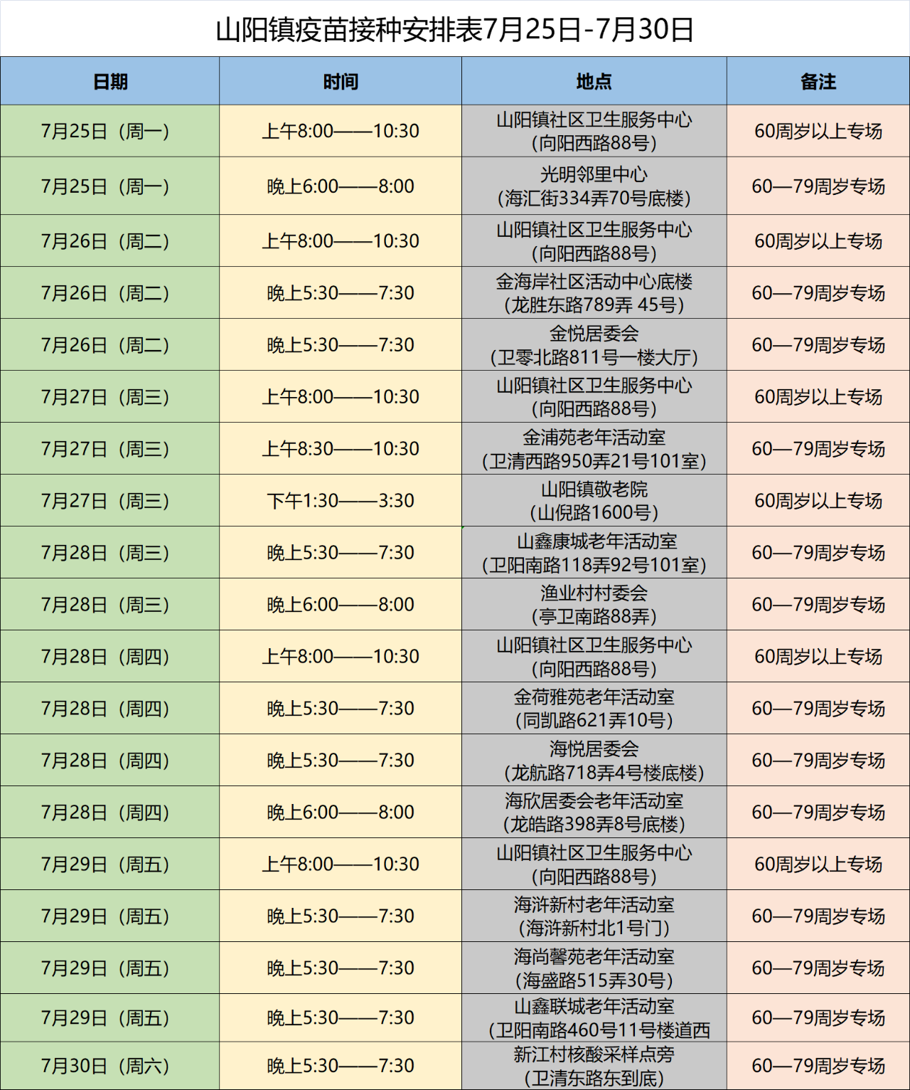 金山区山阳镇7月25日至30日老年人疫苗接种安排
