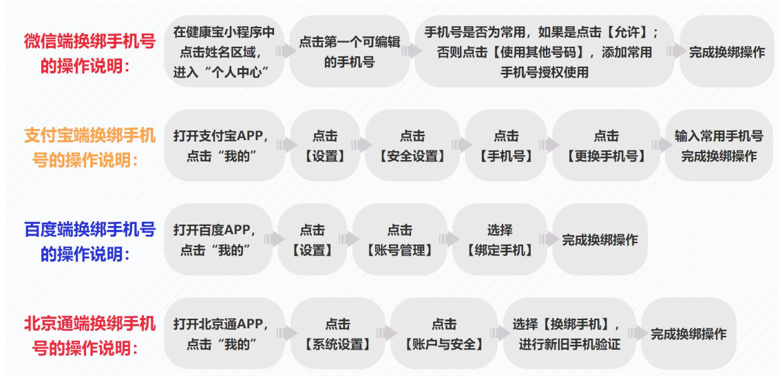 如您在微信、支付宝两平台北京“健康宝”绑定手机号不同,则两个手机号均需完成行程核验。您可以在“健康宝”的个人中心内进行手机号换绑,已绑定的手机号需在原授权绑定该手机号的平台进行换绑(即,微信端绑定的手机号需在微信端换绑,支付宝端绑定的手机号需在支付宝端换绑)。