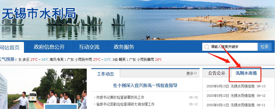 如下图,点击网页右上角【汛期水雨情】,即可查询无锡汛期期间每天的降水情况,水位情况等。