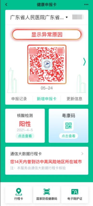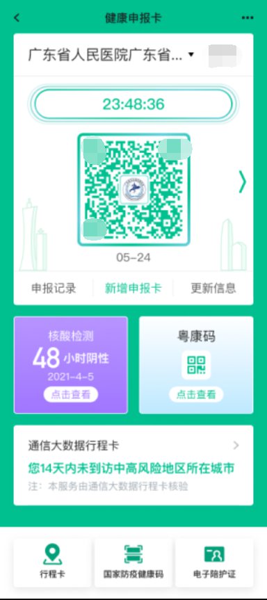 预检分诊健康申报卡和电子陪护证系统是基于广东电子健康码进行建设,汇聚了粤康码、国家防疫健康码、通信行程卡、粤核酸、全国中高风险地区等信息,群众在完成预检分诊健康申报卡申领后,可点击粤康码或国家防疫健康码按钮,直接出示健康码信息,不需要群众反复切换不同软件平台,出示相关健康码、行程卡信息,大幅提高医院通行效率和流行病学调查质量。