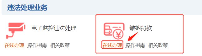 二、互联网注册用户在互联网登录后,点击【违法处理业务】→【缴纳罚款】进入缴纳罚款流程。