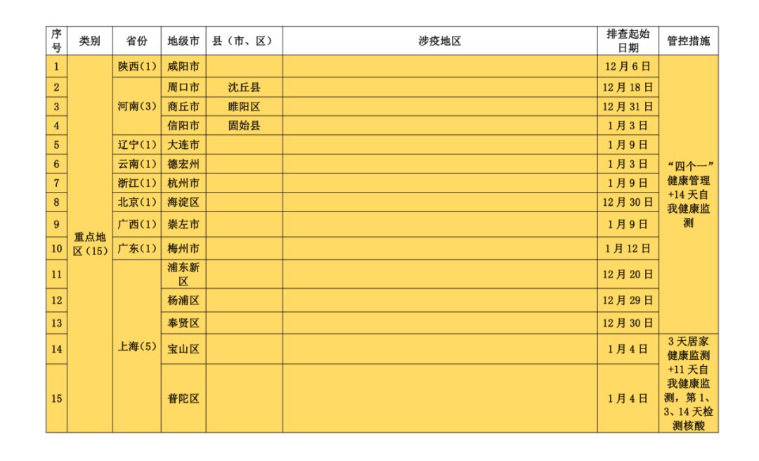 5. 【重点地区】来(返)清人员:“四个一”健康管理+14 天自我健康监测:陕西咸阳市,河南周口市、信阳市、商丘市,上海浦东新区、杨浦区、宝山区、奉贤区,辽宁大连市,云南德宏州、浙江杭州市、广东珠海市。