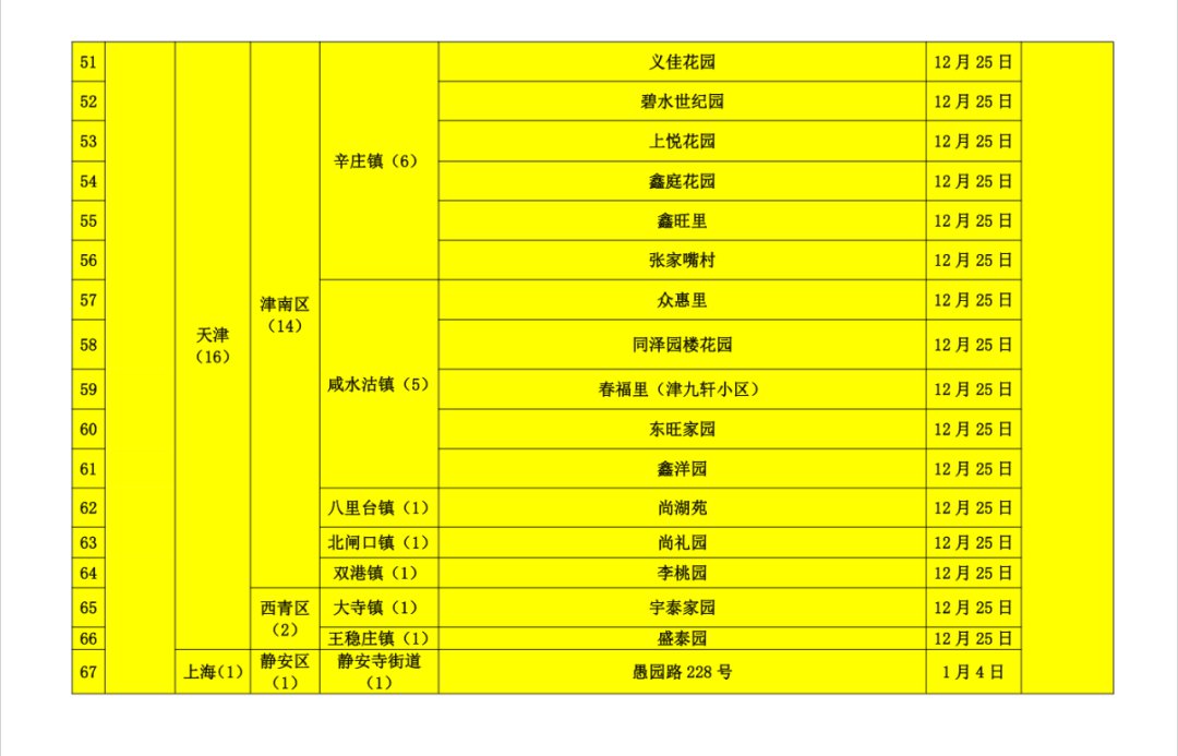 河南许昌禹州市(12月19日以来)和安阳汤阴县(12月25日以来)、天津津南区辛庄镇和咸水沽镇(12月25日以来),陕西西安市(12月3日以来)。