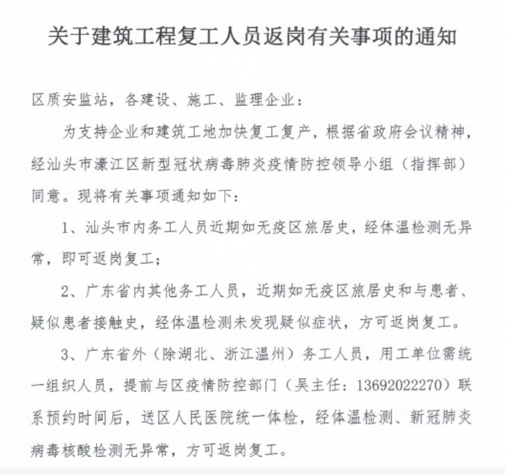 汕头市内务工人员近期如无疫区旅居史,经体温检測无异常,即可返岗复工;广东省内其他务工人员,近期如无疫区旅居史和与患者、疑似患者接触史,经体温检测未发现疑似症状,可返岗复工。