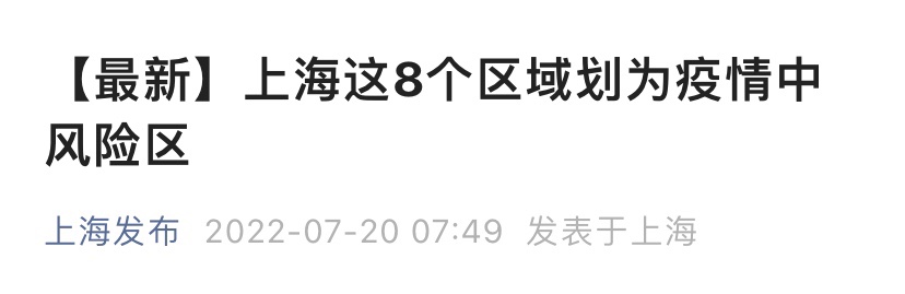 上海市新冠肺炎疫情防控工作领导小组办公室发布消息:根据《新型冠状病毒肺炎防控方案(第九版)》要求,经研究决定,调整本市以下区域风险等级(具体时间根据相关区域按照国家要求落实相应管控措施起计算)。