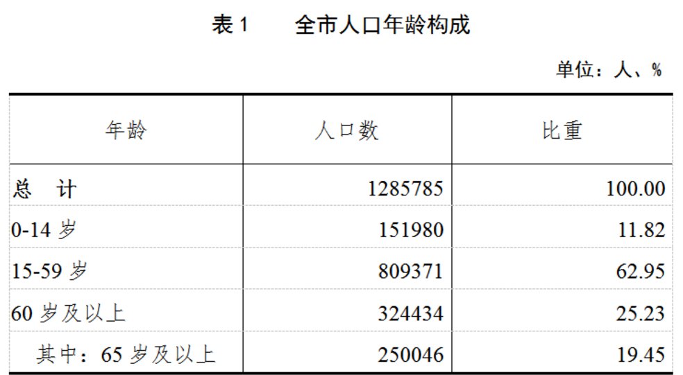 全市常住人口中,0-14岁[4]人口为151980人,占11.82%;15-59岁人口为809371人,占62.95%;60岁及以上人口为324434人,占25.23%,其中65岁及以上人口为250046人,占19.45%。与2010年我市第六次全国人口普查相比,0-14岁人口的比重上升1.40个百分点,15-59岁人口的比重下降8.82个百分点,60岁及以上人口的比重上升7.42个百分点,其中65岁及以上人口的比重上升7.96个百分点。
