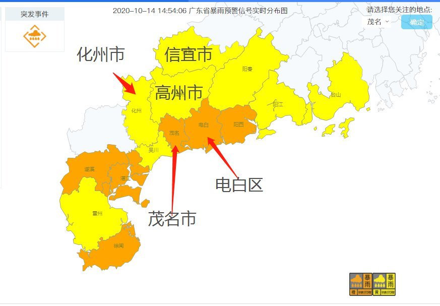 ↓下图为10月14日下午14时54分,广东省暴雨预警信号实时分布图,暴雨橙色/黄色预警信号↓