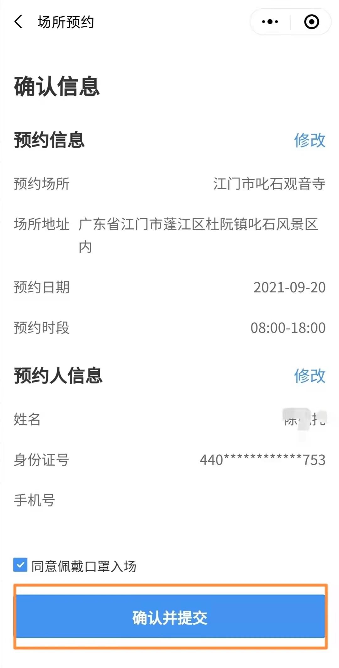 12、确认预约信息,并“同意佩戴口罩入场”。