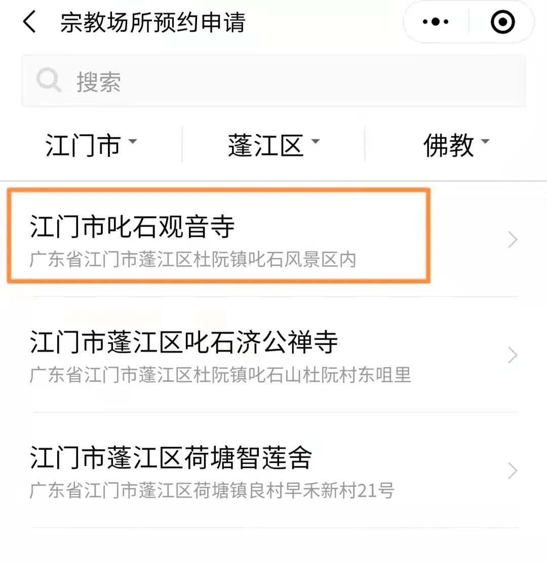 8、选择“江门市”、“蓬江区”、“佛教”、“江门叱石观音寺”。