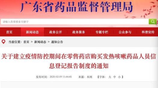 2月9日,广东省药品监管局、广东省卫生健康委员会、广东省市场监管局、广东省医疗保障局联合发布《关于建立疫情防控期间在零售药店购买发热、咳嗽药品人员信息登记报告制度的通知》,提出自2月9日起,全省所有零售药店在销售发热、咳嗽类药品时实行登记报告制度。