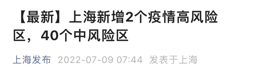 上海市新冠肺炎疫情防控工作领导小组办公室发布消息:根据《新型冠状病毒肺炎防控方案(第九版)》要求,经研究决定,自2022年7月9日起,调整本市以下区域风险等级,上海市其他区域风险等级不变。