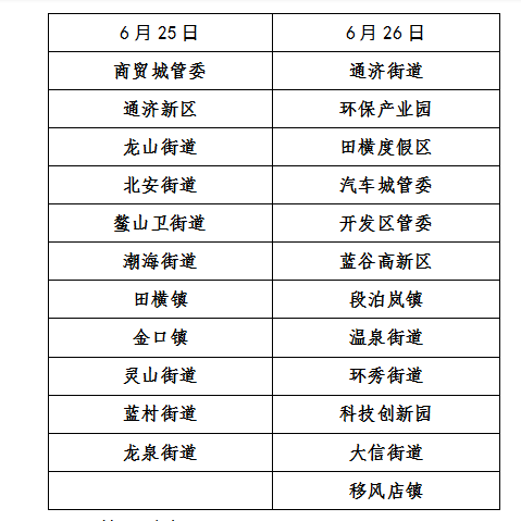 各镇街、功能区两天分批次完成,具体安排见下表。