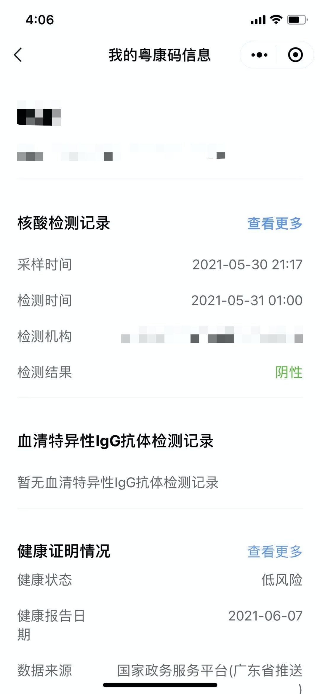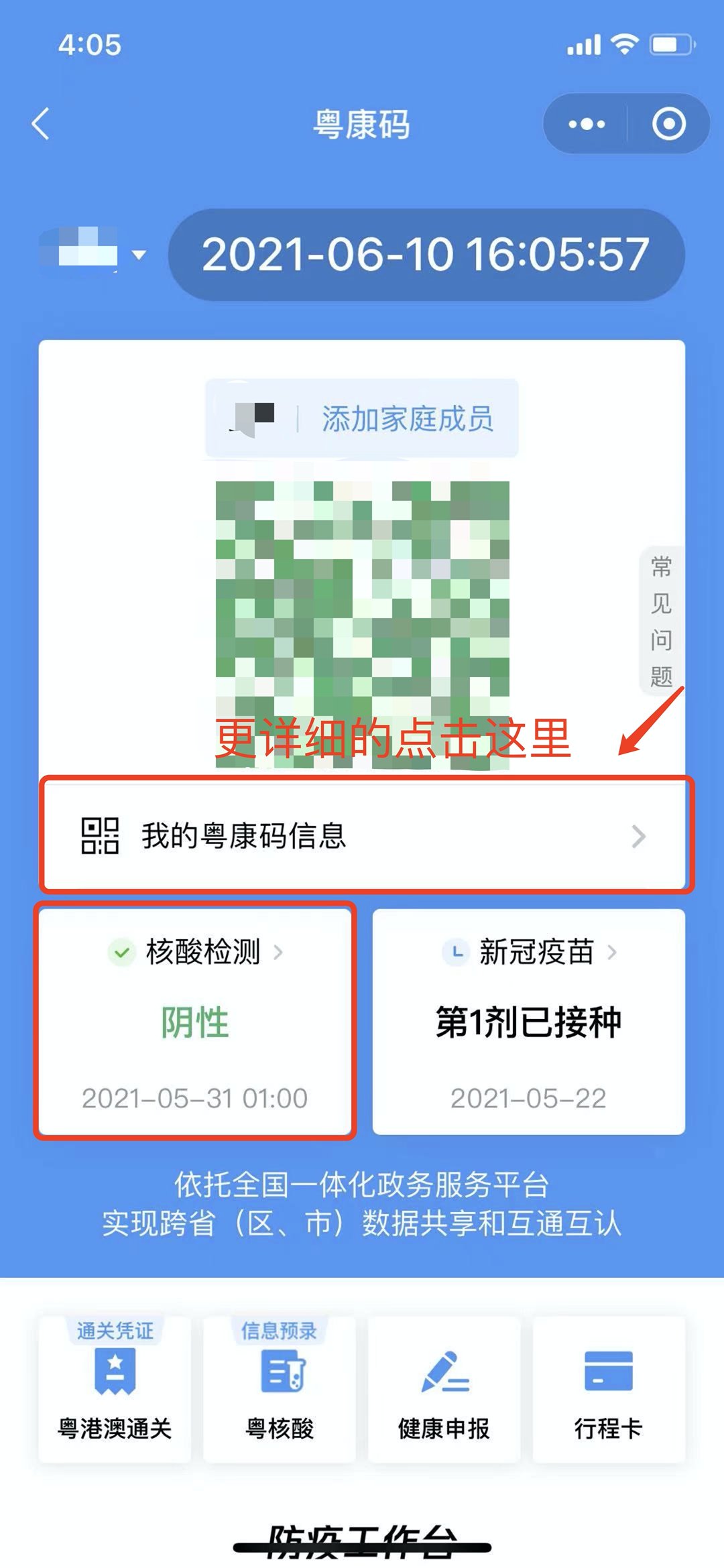第二步:登录之后,点击首页的“粤康码”--这一步就可以直接看到啦,更详细的信息可以点击“核酸检测”或“我的粤康码信息”都可以。