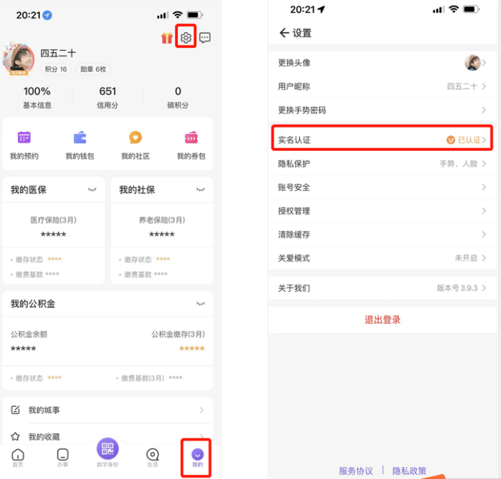 方法二:首页点击【我的】,选择右上角【设置】,选择【实名认证】,选择适合的途径完成实名认证。