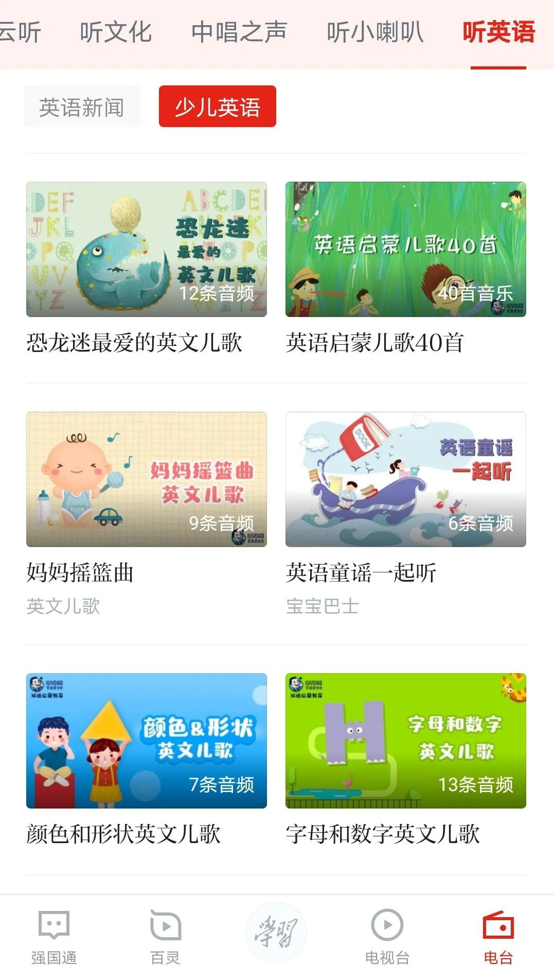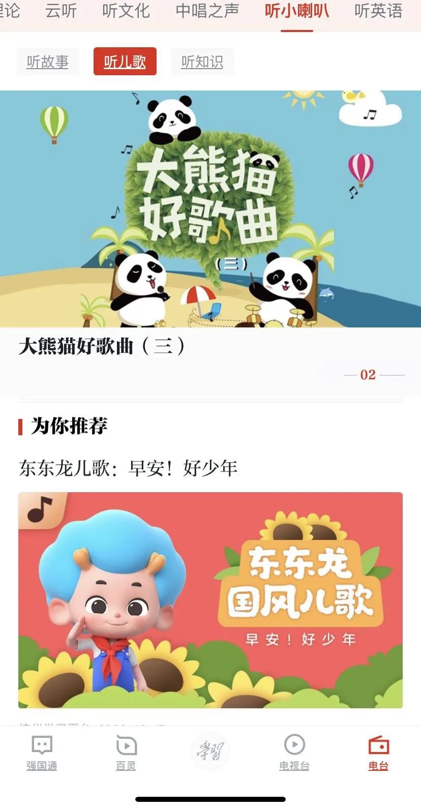 聊了许多“看”的内容,为了保护孩子们的视力,APP强大的“听力”功能不得不提。从下方“电台”频道进入,顶头能看到听同期声、听原著、强国之声、听广播、听新闻报摘、听理论、云听、听文化、中唱之声、听小喇叭、听英语等子栏目。