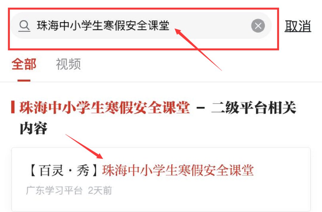 在搜索栏处输入“珠海中小学生寒假安全课堂”,再点击“【百灵·秀】珠海中小学生寒假安全课堂”即可观看视频内容。